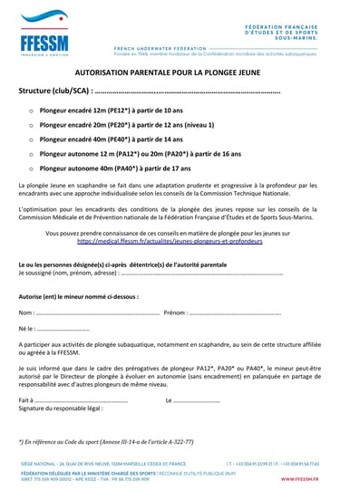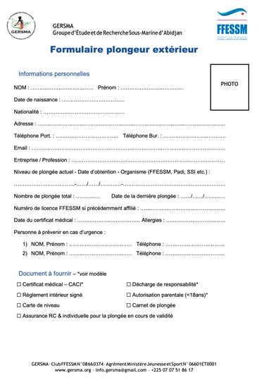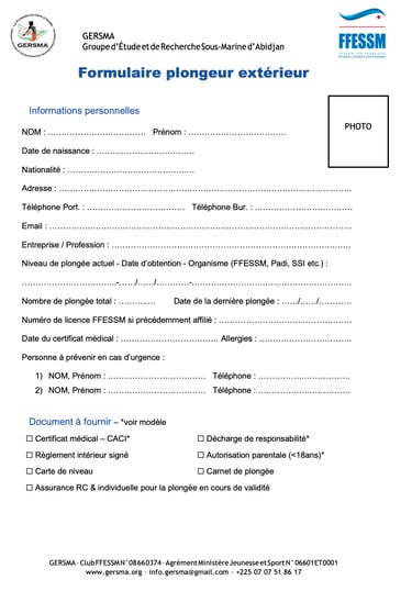 Les plongeurs de passage souhaitant plonger occasionnellement comme extérieurs, ainsi que les mineurs, trouveront aussi les formulaires leur correspondant.