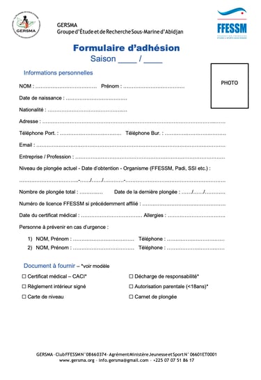 Le dossier d'adhésion pour la nouvelle saison (comprenant le certificat médical et le règlement intérieur) est disponible en cliquant sur l'image ci-après. Merci de le remplir, de signer et déposer le dossier avec une photo d'identité au bureau du GERSMA.