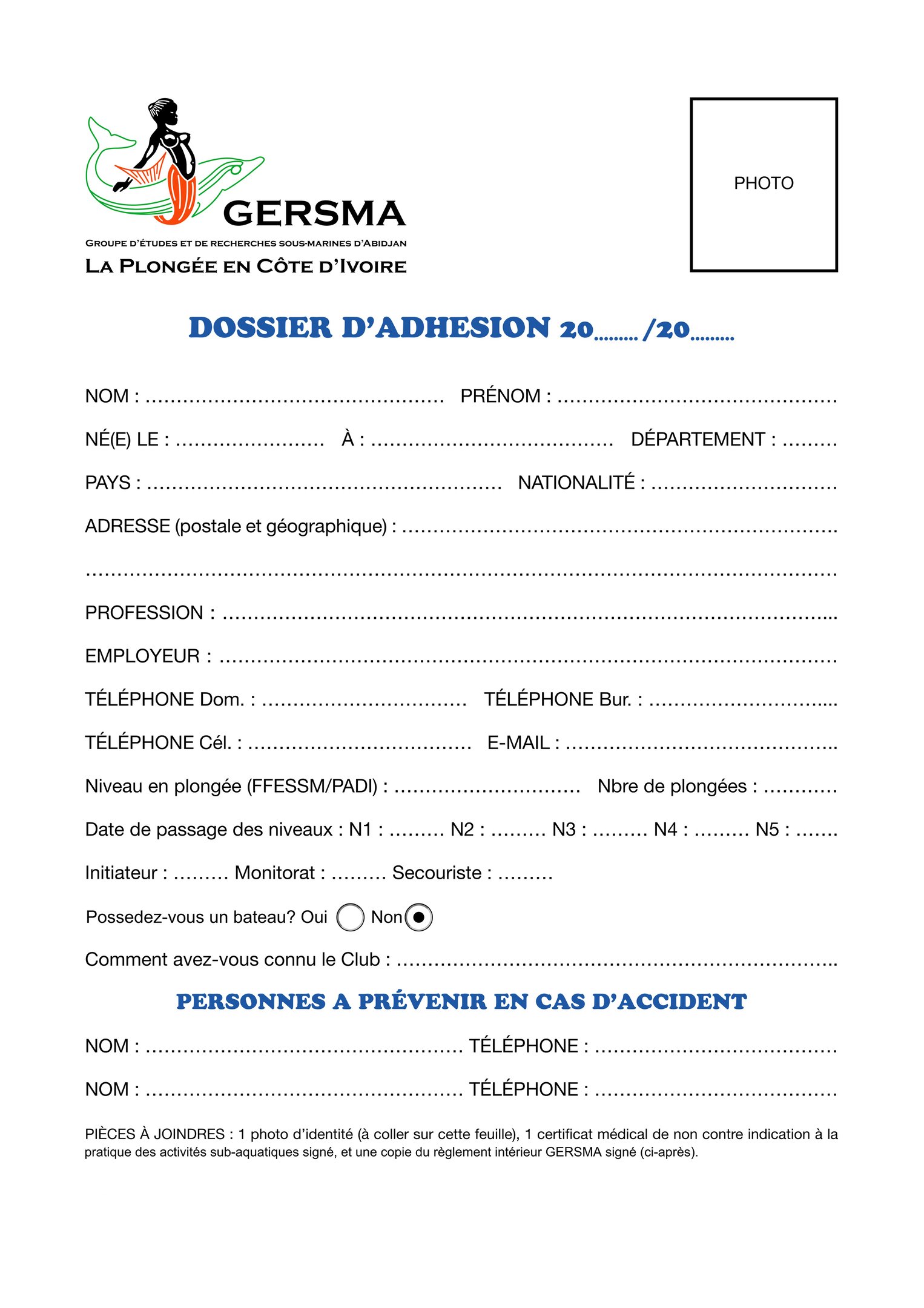 Le dossier d'adhésion pour la nouvelle saison (comprenant le certificat médical et le règlement intérieur) est disponible en cliquant sur l'image ci-après. Merci de le remplir, de signer et déposer le dossier avec une photo d'identité au bureau du GERSMA.