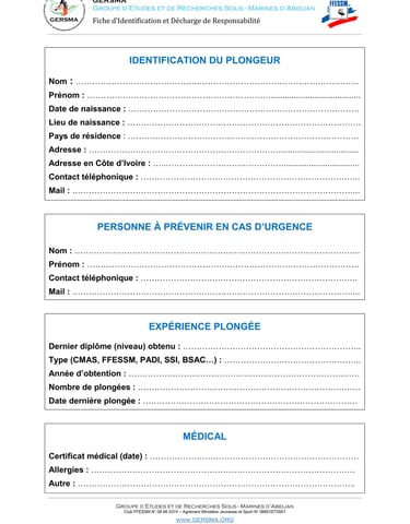 Seul club de plongée de Côte d’Ivoire, le GERSMA est affilié à la Fédération Française d’Études et de Sports Sous-Marins. Nous plongeons principalement sur des épaves et sur une plate-forme pétrolière désaffectée. N’hésitez pas à nous contacter si vous avez des questions sur nos activités ou sur ce dossier d’adhésion.