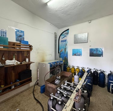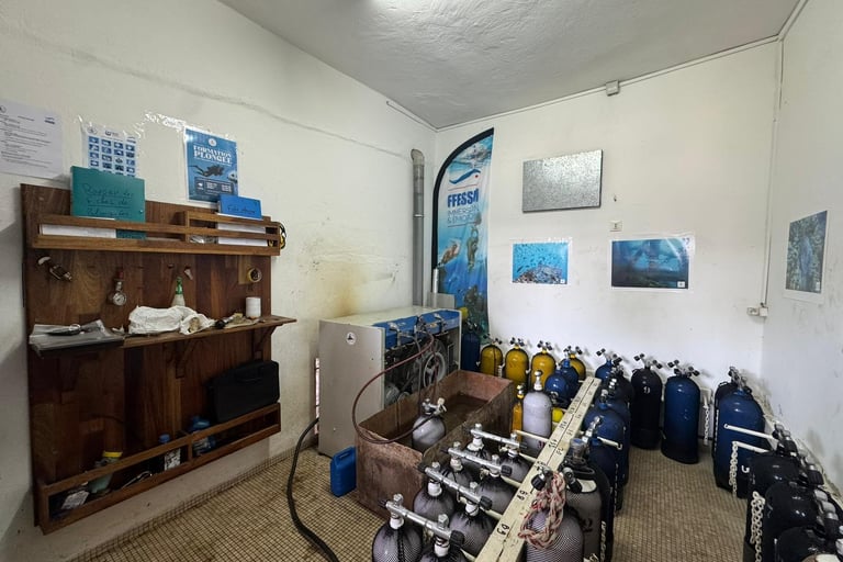 En outre, le club dispose d'un compresseur et d'une trentaine de bouteilles en acier (ou blocs) de 12 litres, 15 litres et 18 litres.